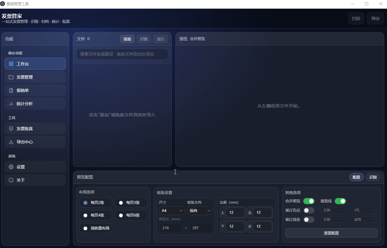 提供灵活的布局选项,支持每页 2 张、3 张、4 张、6 张票据排版,也可自定义尺寸(默认 210×297mm,适配 A4 纸),特别优化高铁票等特殊票据的专属布局,提升排版精准度。