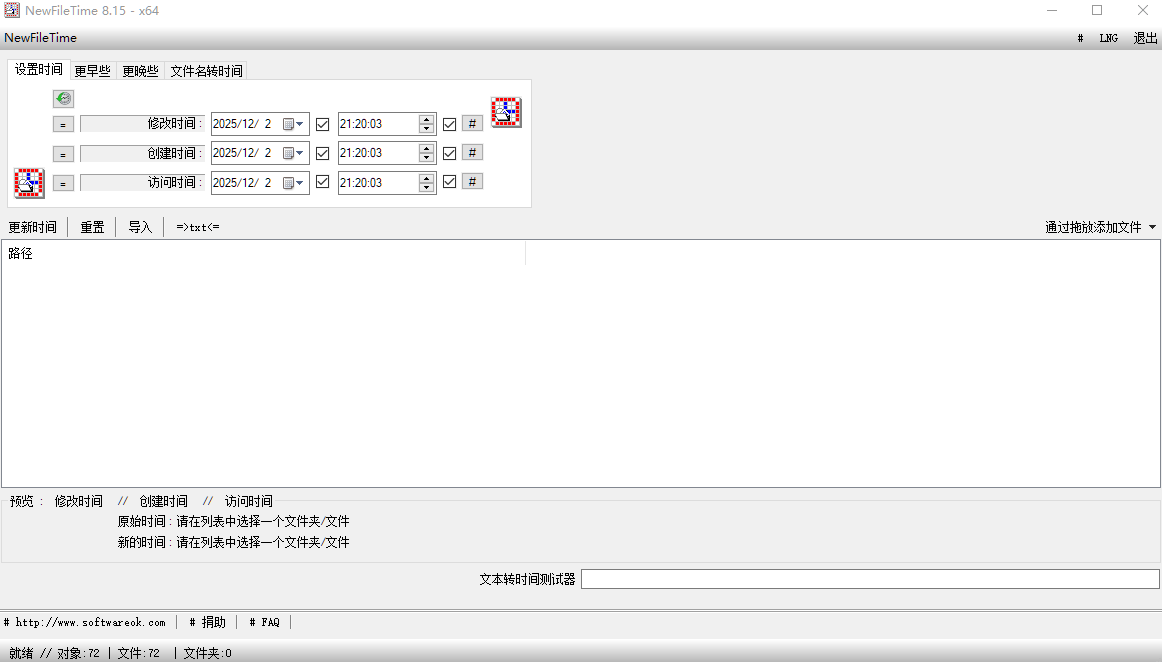 支持拖拽操作添加多个文件或文件夹,一键完成所有选中对象的时间戳批量修改,大幅提升文件管理效率,尤其适合批量整理照片、项目文档等资料。
