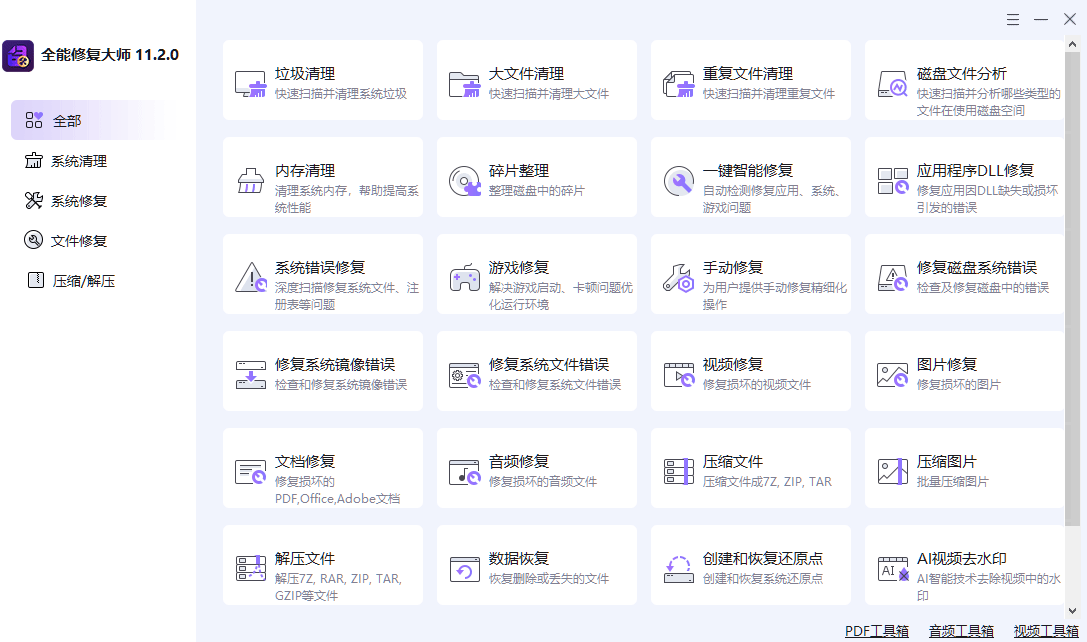 涵盖系统文件修复、注册表清理、驱动修复、DLL 修复等核心功能,可深度扫描并解决病毒攻击、意外关机导致的系统异常,支持离线修复模式,无需联网即可恢复核心文件。